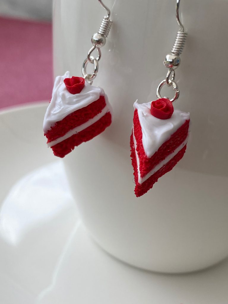 Red velvet taarten hebben een prachtig fluweelrode kleur en een chocoladesmaak. De glazuurlaag is van witte chocola met roomkaas. Ben je ook zo fan van deze verrukkelijke taarten? Dan kan je dit nu aan iedereen showen door deze mini taartjes in je oren te hangen!