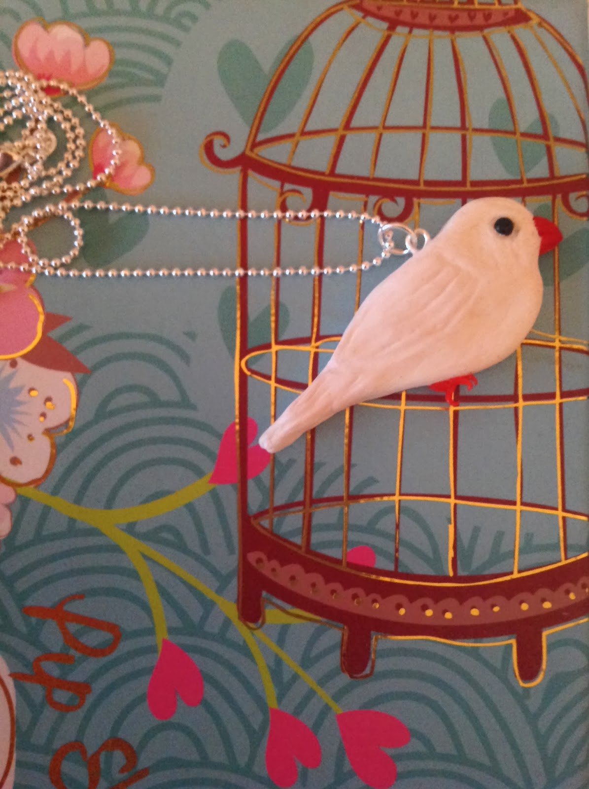 Joella stuurde mij een berichtje op het forum van passion2create. Met de vraag of ik haar vogeltje na wilde maken van fimoklei. Dit leek mij een onwijs gave uitdaging. Ik had wel al een aantal paardenhoofdjes nagemaakt maar een vogeltje is toch weer heel anders. Vooral de snavel vond ik erg lastig om precies na te maken. Maar ik streef altijd naar perfectie dus na zo’n 10 a 20 keer proberen had ik mijn perfecte snaveltje! Ik ben erg blij met het resultaat. En omdat het zo een mooi vogeltje is heb ik hem aan een echt zilveren kettinkje gehangen. Joealla is heel blij met haar ketting!